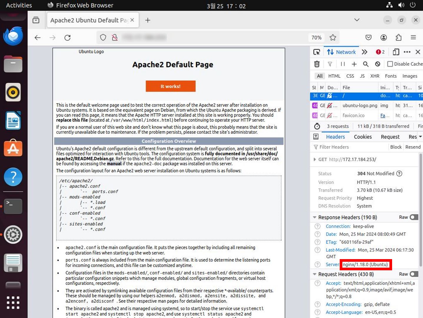 Nginx 기동 후에도 Apache2 default page가 출력됨