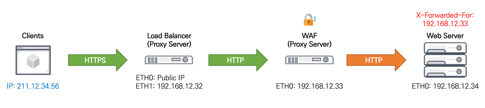 최상단인 LB에서 복호화하지 않고 WAF에서 복호화했으며, 각 프록시 장비에 XFF 설정을 하지 않아서 웹서버에는 클라이언트의 IP가 도달하지 않고 상단 서버인 WAF의 사설 IP만 출력됩니다.