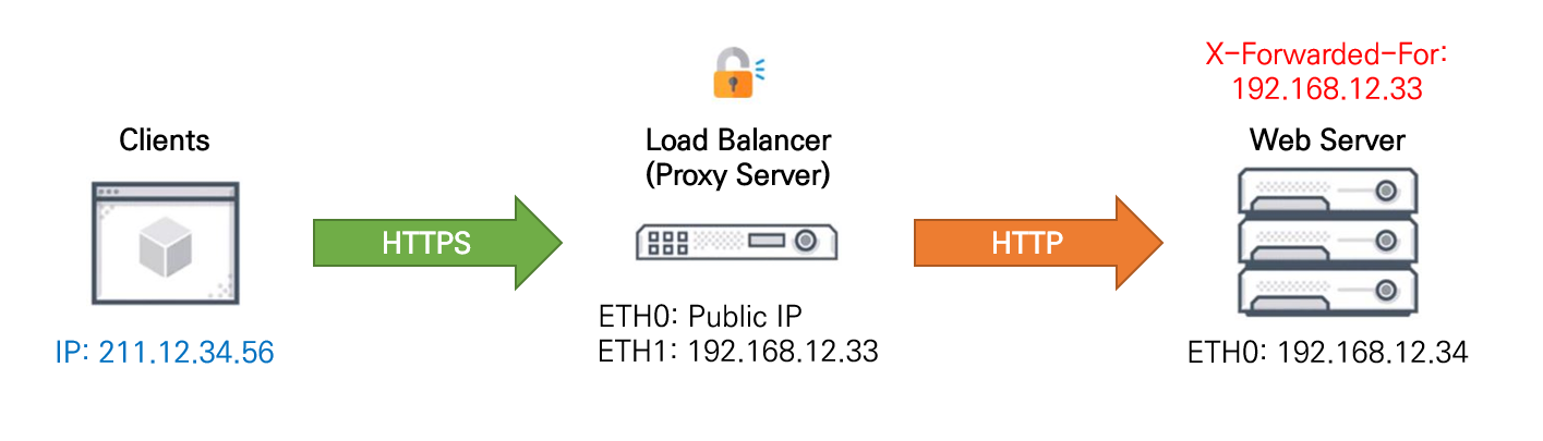 이 경우에는 앞단에 거쳐가는 장비가 없기 때문에 XFF 설정을 따로 추가하지 않더라도 클라이언트의 본래 IP가 식별됩니다. 추가로 해당 케이스는 웹 서버 상단에 IPS나 WAF, DDos 장비 같은 공격을 탐지·방어할 수 있는 장비를 설치하지 않고 클라이언트가 바로 웹 서버로 접근하여 시스템 보안이 취약해지는 구성으로 보통 사용하지는 않는다는 것을 참고바랍니다.