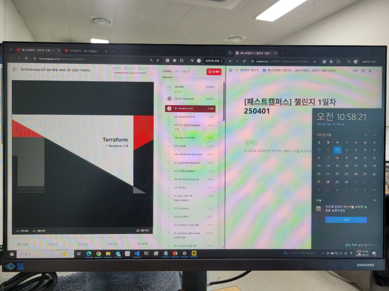 오늘부터 DevOps 강의를 수강하게 되었다. 제일 처음 마주한 챕터는 Terraform이다. 오늘 공부한 부분은 Terraform 내용 중 소개와 특징, 예시, 장단점 등 Terraform의 간단한 개요와 문법의 HCL 문법의 일부를 배우기 시작했다.